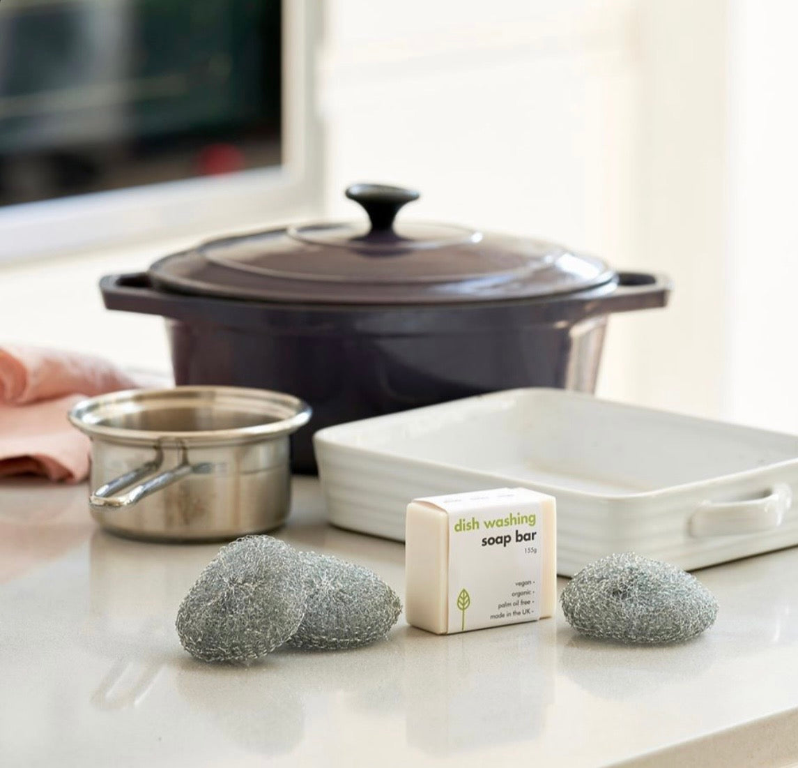 A set of 3 galvanised steel scourers. Plastic free, reusable and recyclable heavy duty scourers. Sponge like cleaning pads, for tough removal of dirt. Anti-rust